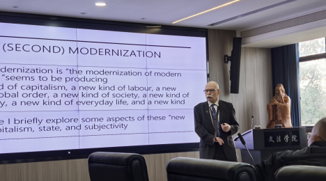 Dickinson教授长期深耕知识体系形成、健康政策与医学社会学领域,具有深厚的学术积淀和国际影响力,曾推动多项中加学术交流与国际合作。报告中,他以二战后西方社会转型为切入点,系统梳理了现代化理论的发展脉络。他指出,二战后西方社会学界形成了两大核心理论流派,其中后现代主义认为西方已超越现代主义阶段,但他更认同“反思性或第二次现代化”理论,强调当代西方仍处于现代化进程中,只是进入了“现代社会自我现代化”的新阶段。