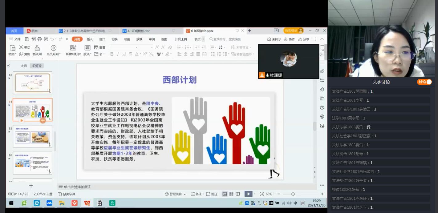 会议伊始,辅导员陈丽老师首先对华中农业大学就业信息网的使用方法进行培训,演示了网上签约、申请就业推荐表、登记毕业去向、查询档案等功能的操作方法。接着,陈丽介绍了当前的就业种类,对基层就业的相关政策进行了详细阐述,强调要理性看待应届生身份。她谈到,现在的“好”以后不一定“好”,现在的“不好”以后不一定“不好”,在做选择时眼光要放长远。随后,陈丽用清晰的表格帮助同学们梳理了各类就业途径的时间安排,介绍了我校就业奖助政策,鼓励大家把握时机、准确定位、主动出击。