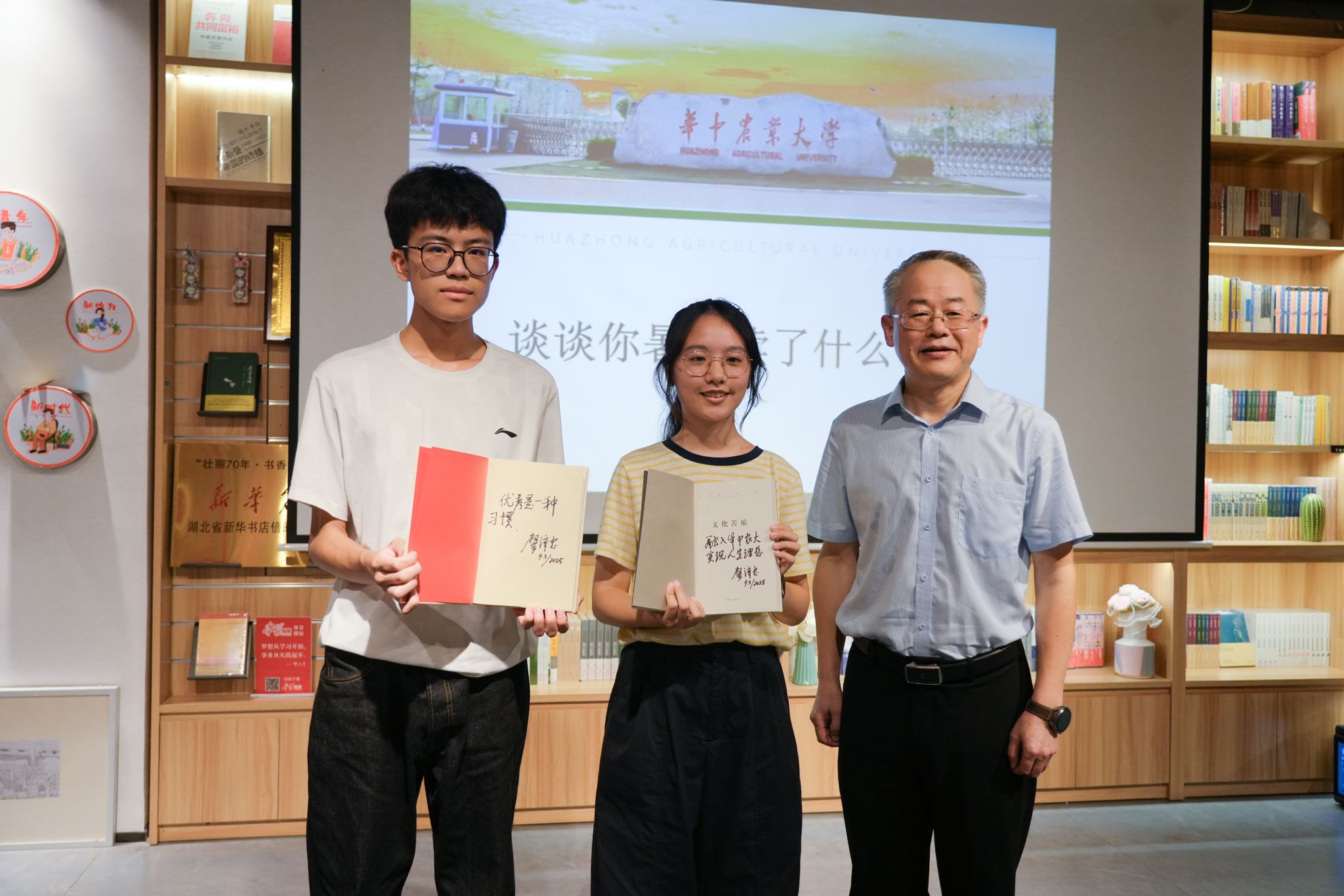 讲话尾声,廖书记以“融入华中农大,实现人生理想”作结,为新生送上殷切期望。随后的赠书环节,廖书记为两个班级分别赠语“优秀是一种习惯”和“融入华中农大,实现人生理想”,勉励同学们在未来四年要不忘初心,在实践中锤炼本领,在奋斗中收获成长。