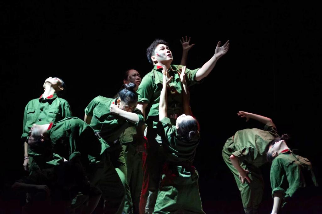 舞台上的一抹绿色,用强有力的动作、柔软的身姿与敬畏的心灵跳出最感染人心的节奏,跳出对革命英雄的敬重,献上一曲振奋人心的“英雄赞歌”。完成作品的过程就像是孕育一个新生命,从无到有一个动机、一瞬间的心底触动,然后慢慢的将它们融合在一起注入血液和生命。参赛选手朱籽瑗分享道:“我们这支舞蹈的技巧是很多的,队里基础好的队员们付出了很多,为我们舞蹈增加了亮点。大家在舞蹈上的情绪融入也是很多的,很多队员在台上甚至哭了出来。”每日的排练让他们不断朝着目标迈进,但也带来了伤痛。为了完成动作,膝盖淤青、胳膊练肿是家常便饭,但坚持不懈地训练让参赛人员在训练中不断地成长。