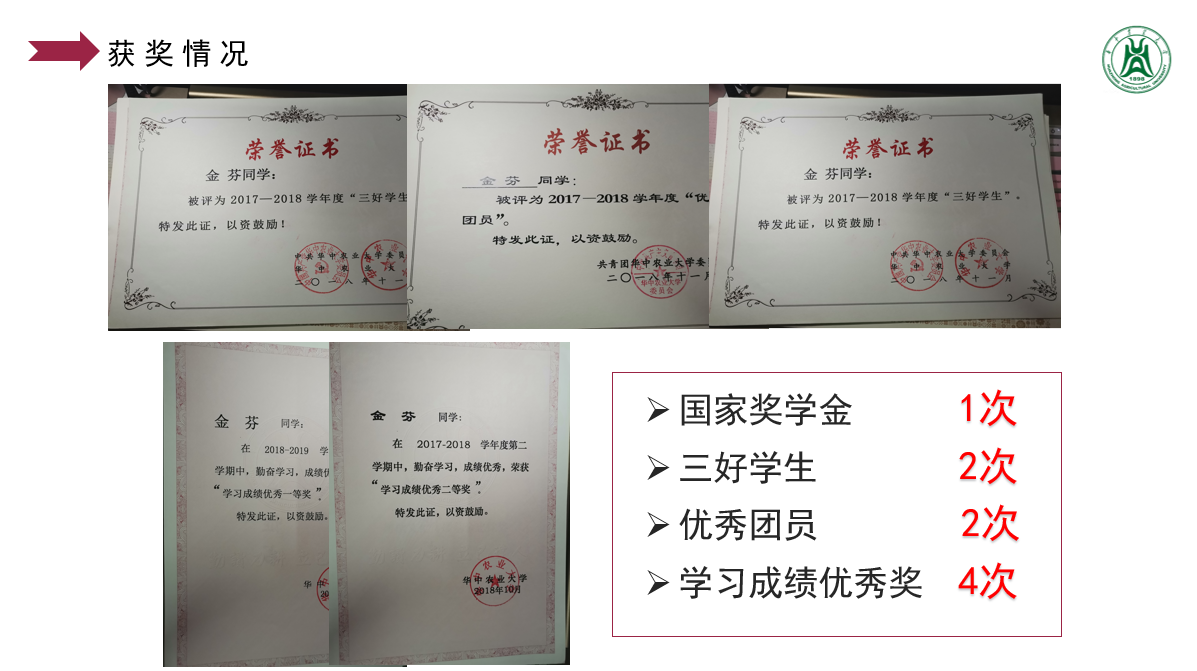 连续五个学期专业成绩排名第一,连续两年综合测评成绩排名第一,四次获得学习成绩优秀奖,两次获得“三好学生”、“优秀团员”称号,一次获得国家奖学金。傲人成绩的背后是金芬对自己下的狠功夫。为了升华理论知识,金芬参加专业相关的技能大赛,上万字的项目策划书是她刻苦求学路的印记。对学习的严格要求,是金芬卓越的藏獒秉性。