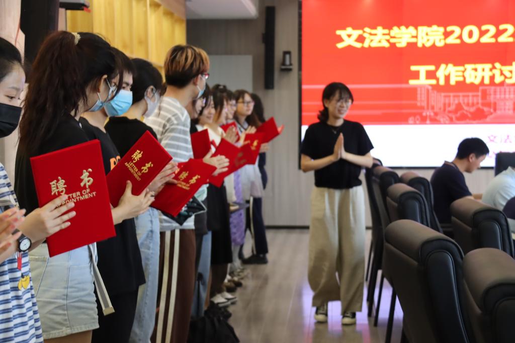 党委书记瞿明勇向2022级新聘班主任颁发了聘书,2022级辅导员刘一丽向学生班主任助理及下班党员颁发聘书并通报了迎新工作准备情况及新生入学教育相关安排。
