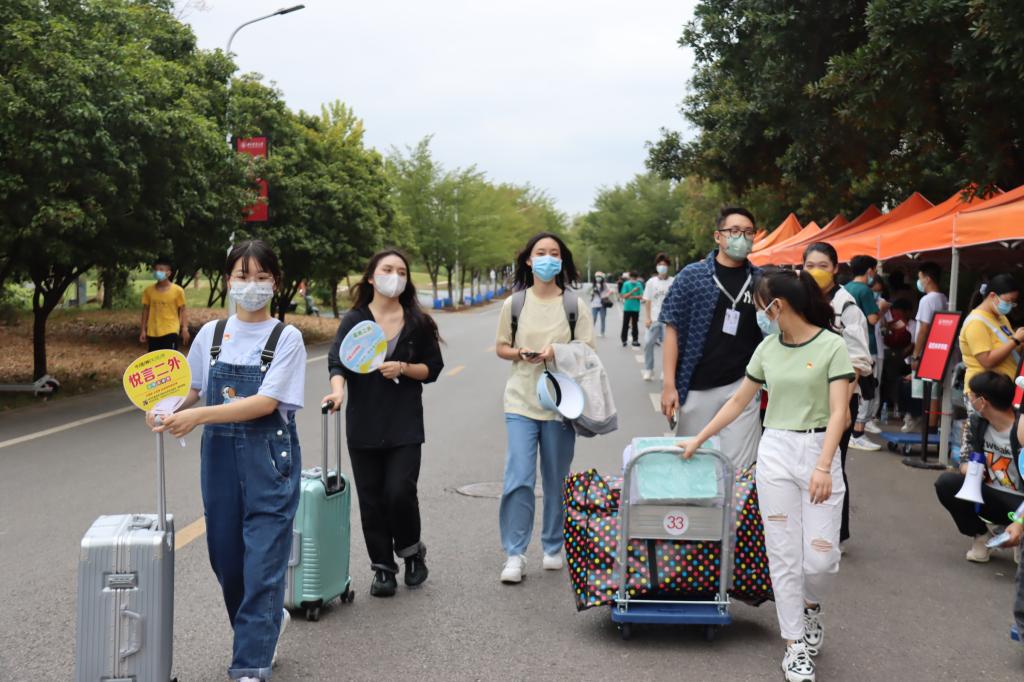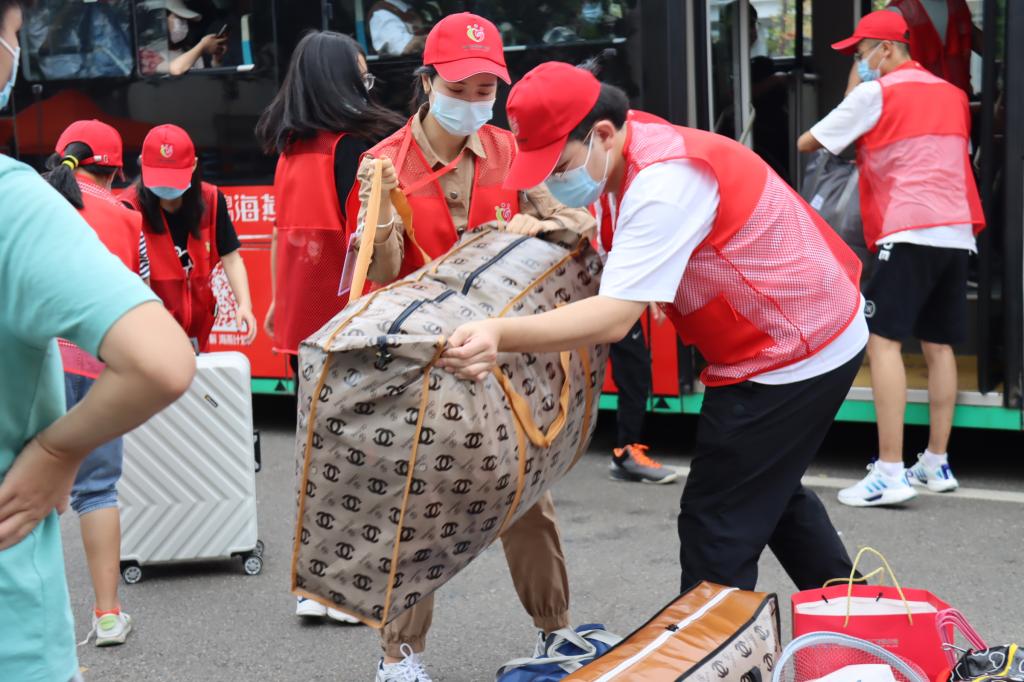 的志愿者一直等候在下车点附近。每一辆满载新生的大巴车驶来时,车窗内那一双双既兴奋又胆怯的眼,便是志愿者们挥洒汗水的动力。“接过你的行囊,我们就是一家人。”等待许久的志愿者会在新生们下车的第一时间接过他们的行李,将他们送到寝室。