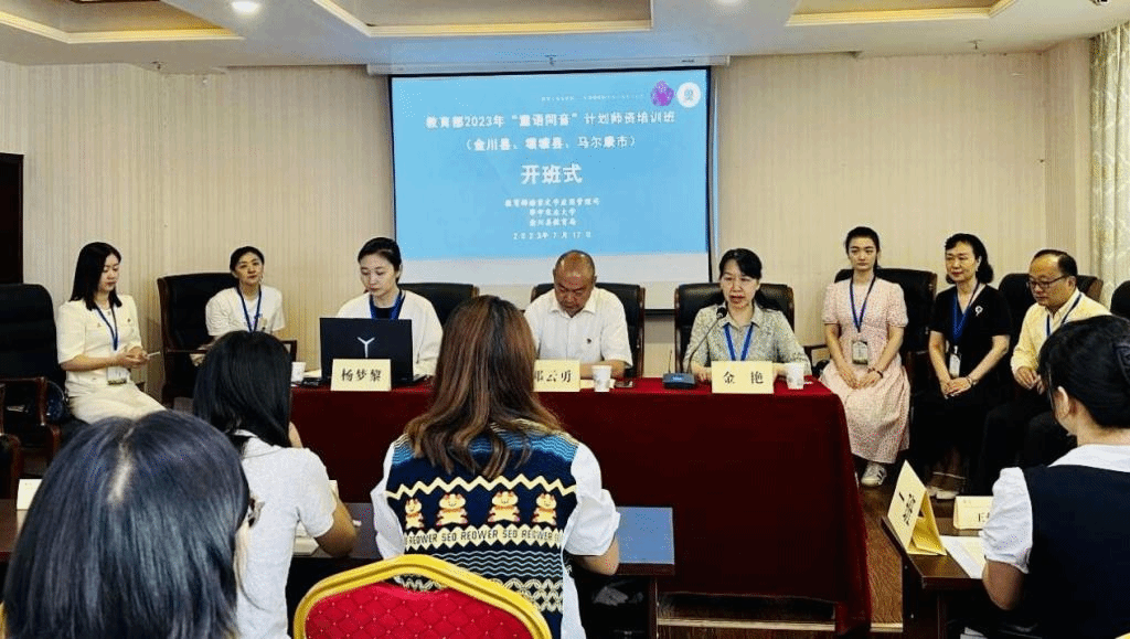 (通讯员 吴雅轩 韩淑芳 金艳)为深入学习贯彻习近平总书记关于国家通用语言文字教育“要从娃娃抓起”的重要指示精神,进一步加大国家通用语言文字在民族地区、农村地区的推广力度,根据教育部语言文字应用管理司工作要求,7月17日上午,教育部2023年“童语同音”计划四川阿坝藏族羌族自治州师资培训项目开班仪式在四川省金川县承运大酒店三楼会议室举行。来自阿坝州金川县、壤塘县、马尔康市三地的100名学员教师与华中农业大学项目团队齐聚壮美金川,共同参加了开班仪式。开班仪式由华中农业大学教育培训88看球apk