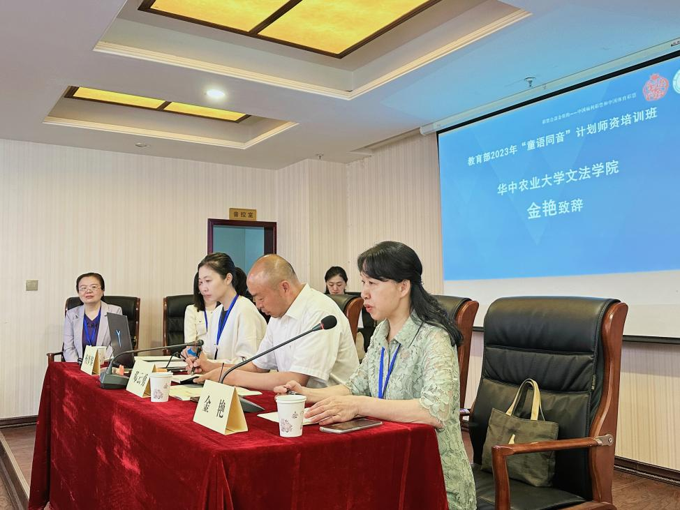国学部主任金艳副教授致辞,金老师代表项目组对来自三个不同县市的100名学员表达热烈欢迎,她表示是“语言的魅力让我们聚拢在一起”。她简要介绍了本次培训三大板块的教学内容,分别是对语言文化内涵以及国家通用语言文字政策法规认知的加深、普通话水平的提高和幼儿园教师语言教学能力的提升。金老师还介绍了此次培训集中授课、小班辅导、互动交流、案例研讨、个性化辅导等多种形式的教学方式。最后,金老师向参训学员强调了此次培训的重大意义,激励学员们珍惜这一次学习机会,努力锤炼教学技能,为有效助力民族地区学前儿童普通话教育贡献力量。