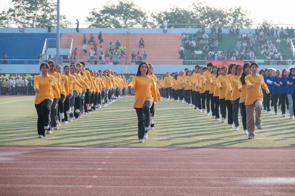 同学们统一穿着黄色院服,排着整齐的队列进入场地。音乐响起,他们动作整齐划一,精神风貌良好,彰显了文法新生的青春风采。