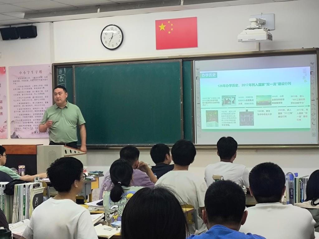 “我高三就在十三班,所以走进来的时候倍感亲切”。在汉中中学,本科生院思政处汉中籍老师王运涛以校友的身份再次回到高中课堂,为仅剩40余天参加高考的高三(13)班学生加油鼓劲。“作为大家的老学长,今天向大家介绍我的大学‘母校’,希望有更多的同学们能来到华农,我们继续成为校友”,王运涛用正宗的汉中方言对同学们发出“邀请”,拉近了与同学们之间的距离。他就学校的办学历史、学科实力、文化建设、录取分数做了介绍。虽然高三的复习氛围紧张且压抑,但这位可爱的“大学长”通过幽默的语言描述自己在大学的精彩生活和今后的人生选择,活跃了课堂气氛,调节了同学们疲惫的身心,同时也为大家心里埋下一颗报考目标院校的种子。