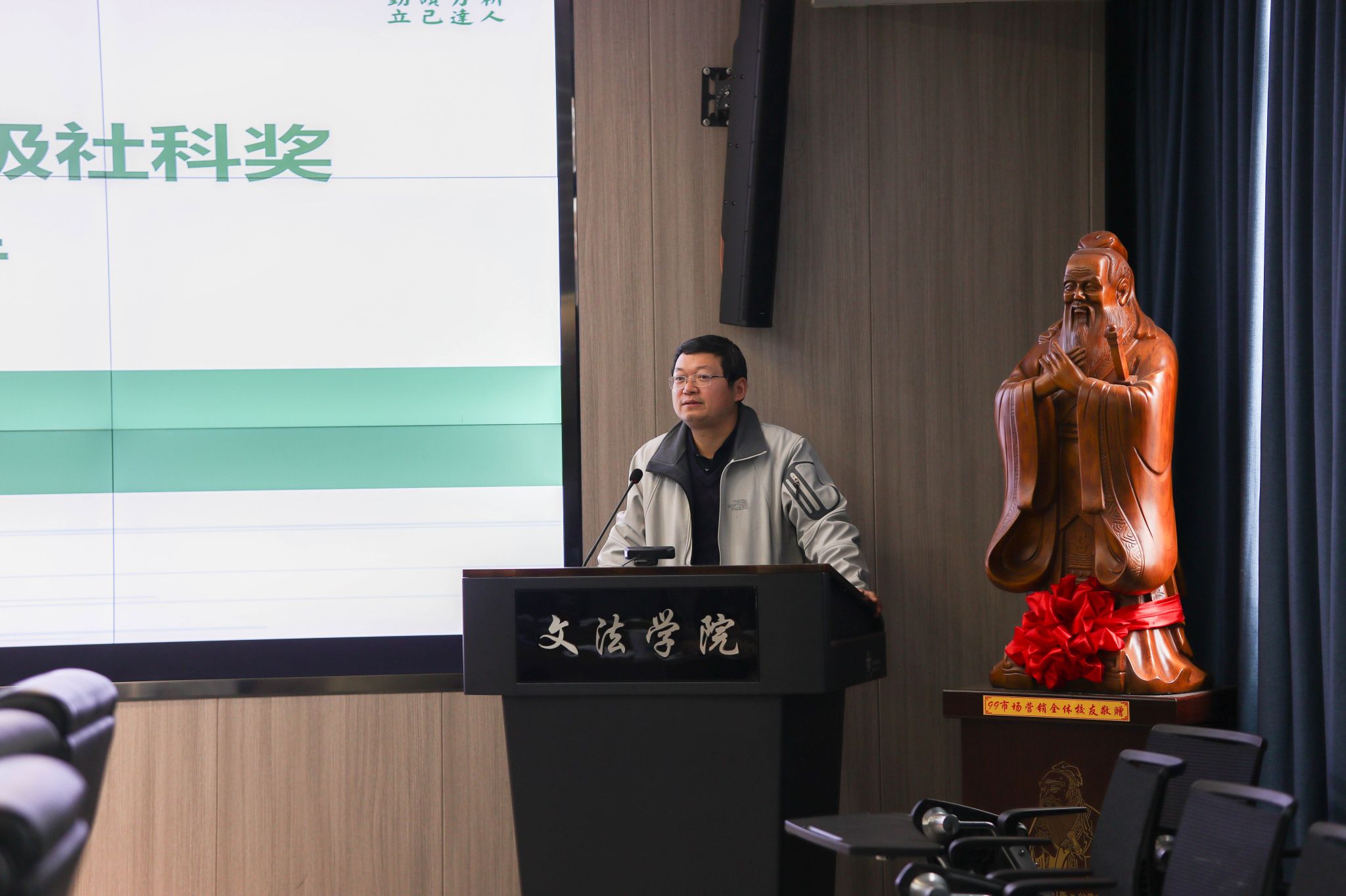 在申报率和立项率方面的成绩。同时,指出了学科发展不均衡、重点项目待突破的问题。此外,他对2025年国家社科基金年度项目工作任务进度及六大工作机制进行了解读,强调选题是项目成功的关键,其公式为“好的选题=研究热点+研究兴趣/能力+平台/地域优势+前期基础”。在省部级社科奖方面,他介绍了湖北省社科优秀成果奖及教育部文科奖奖项设置、申报流程及我校获奖概况,提出了瞄准一个学者、深耕一个学问领域、拿下一个重大项目、产出一个标志性成果、获一个高层次奖励、成长为一个标签人才、服务一个学科发展 “七个一” 机制,推动文科发展进入良性循环。