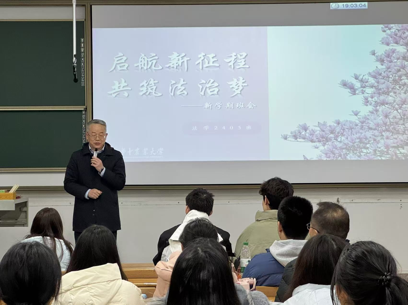 廖济忠走进法学2403班班会现场。他以deepseek问世、《哪吒之魔童闹海》大热及春晚曲目《世界赠予我的》三个热点话题为切入点,用“活着就是最大的神迹”“一曲空灵听赠予,大千世界炼安心”和“我命由我不由天”三句寄语勉励同学们寻找生命真谛、诠释自我价值,在法学领域不断学习探索。班主任裴敬伟、辅导员张思琪、学生班主任助理杨振宇和下班党员崔然向同学们介绍法学专业及班级基本情况,与同学们展开了热情洋溢的交流,一同畅聊大学生活的新篇章。