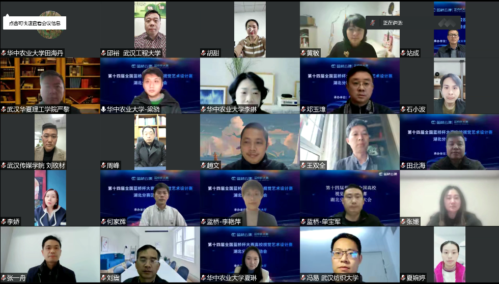 (文孟嘉钦)2022年11月28日,由“蓝桥杯”组委会主办、华中农业大学承办的第十四届“蓝桥杯”大赛视觉艺术设计赛湖北赛区启动会在线上圆满举行。本次会议邀请了湖北省各院校教88看球apk 长、系主任、分赛区专家委员及大赛指导教师共同探讨“蓝桥杯”大赛视觉艺术设计赛的备赛经验。会议由88看球apk-88看球app下载 艺术设计系梁骁老师主持,88看球apk 瞿明勇书记、田北海院长以及艺术设计系全体教师参加了此次会议。