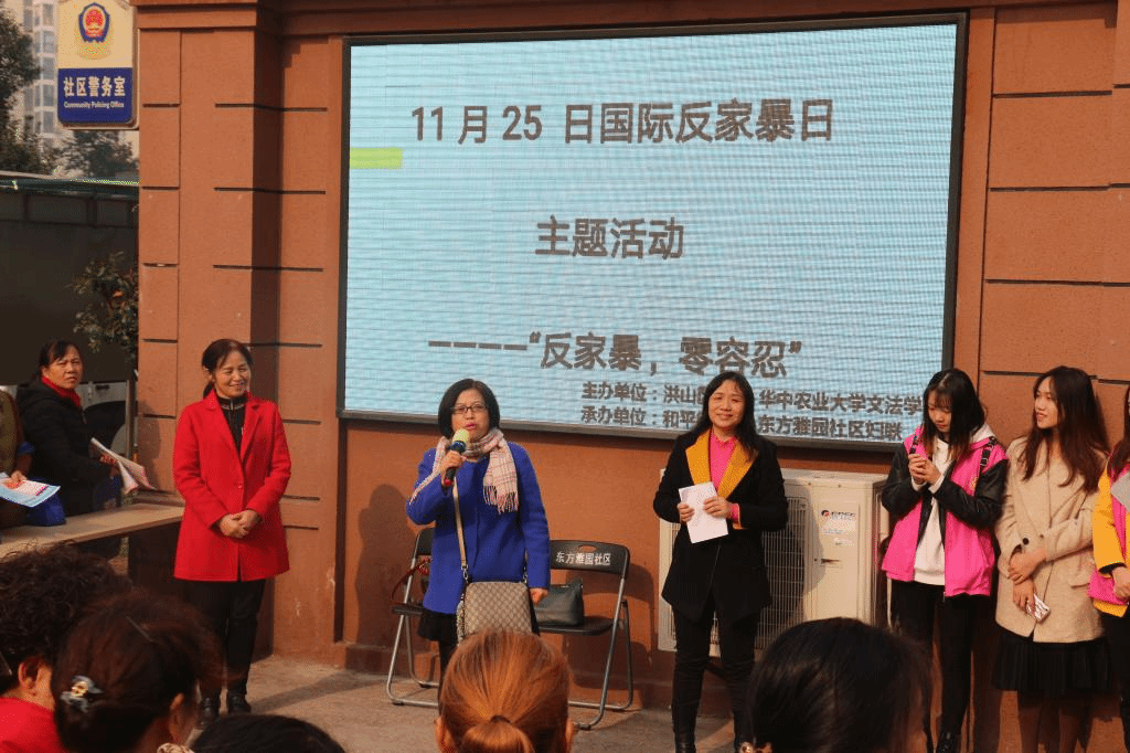社会工作系与洪山区妇联于武汉市洪山区东方雅园社区共同举办了“反家暴,零容忍”的国际反家暴主题宣传活动。