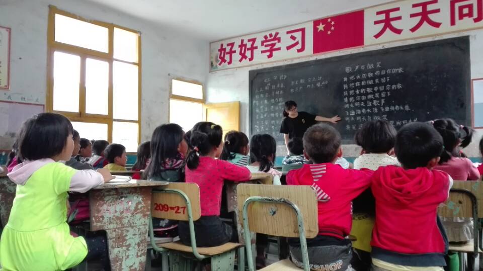 8:20,钟声还未消散,孩子们就已经端坐在自己的座位上,眼睛直勾勾地盯着教室门口的方向,直到看见支教老师拿着教案的身影走进视野,才肯慢慢收回凝望的目光,马上摆出一副认真听课的神情。孩子们一本正经的表情逗乐了前来上课的老师,后者故意绷着的脸一下子耷拉下来,原本紧张的气氛一时间缓和了许多。