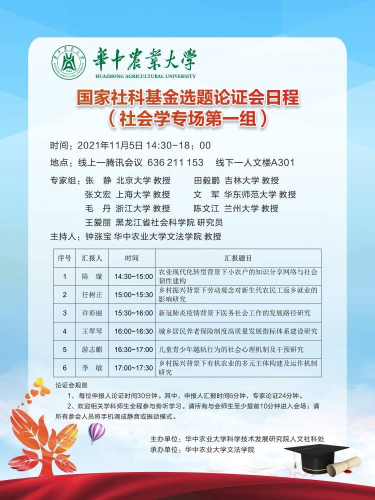 地址:湖北省武汉市洪山区狮子山街一号华中农业大学人文社科楼