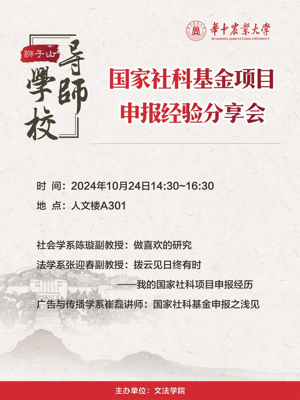 地址:湖北省武汉市洪山区狮子山街一号华中农业大学人文社科楼