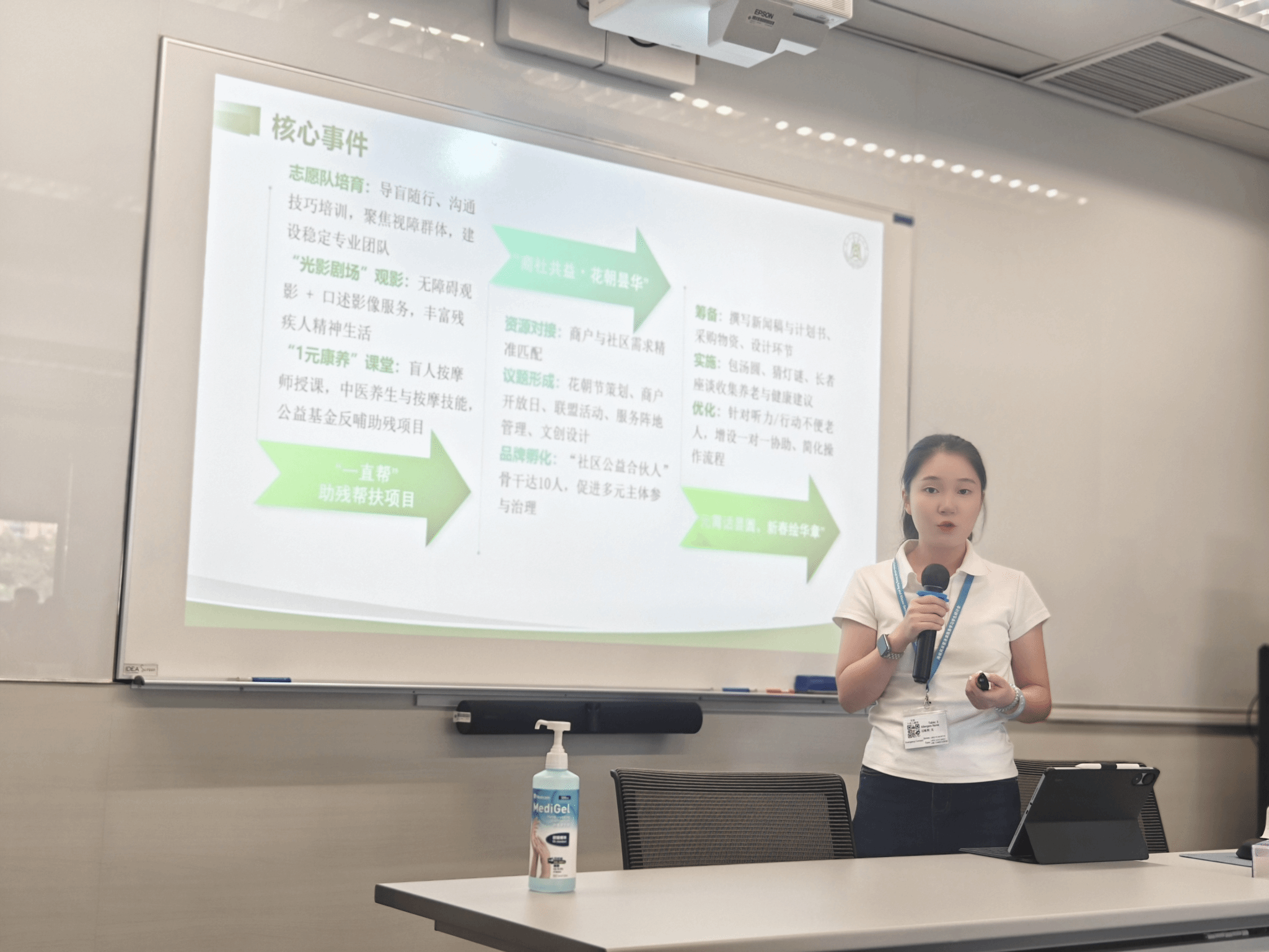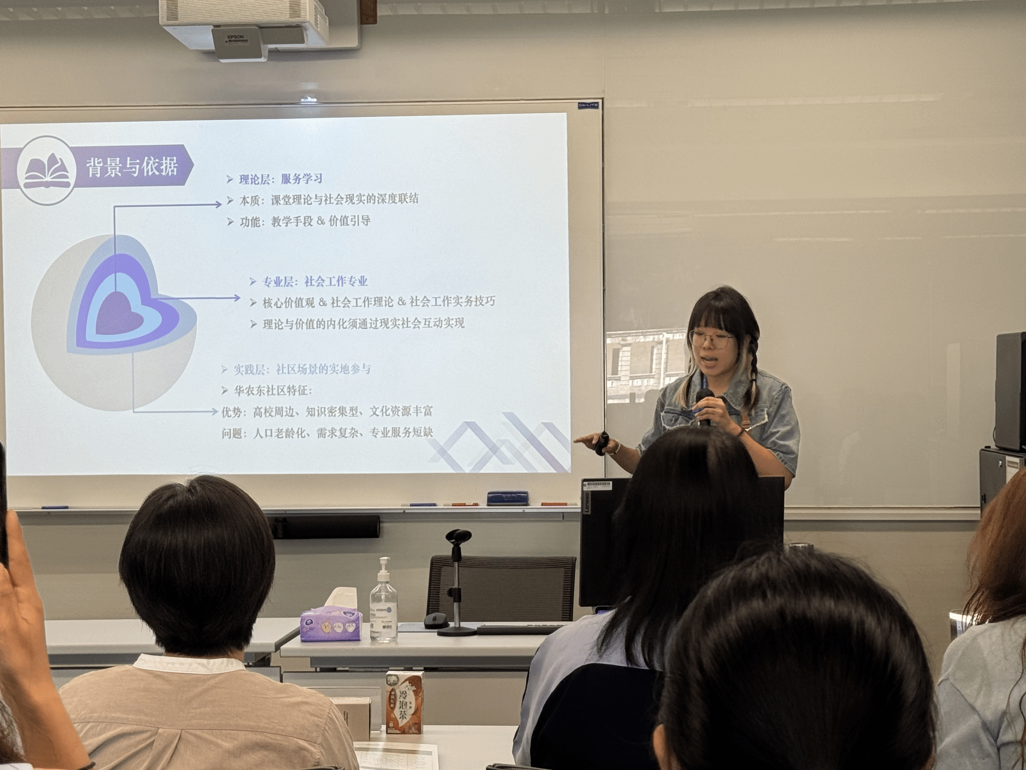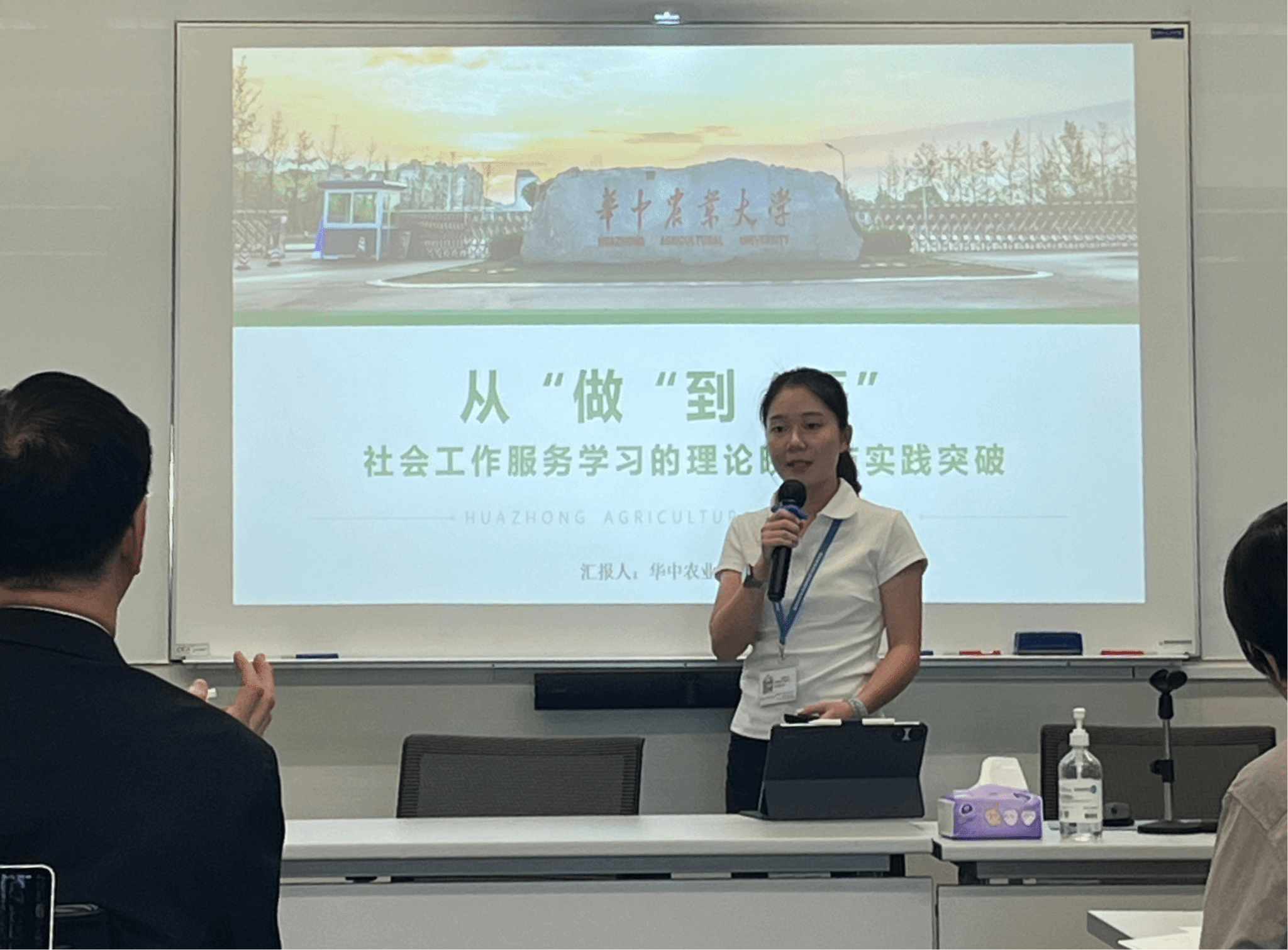 在个人汇报环节,孙心聪同学以华中农业大学东社区的服务学习项目为例,系统阐述了该项目的回应的问题、实施过程、社会影响以及自我反思。她的汇报《学以致用,行中致思:服务学习的影响与反思》荣获服务学习个人汇报金奖。王喆同学则基于在粮道街街道社工站的实践,做了《从“做”到“悟”:社会工作服务学习的理论映照与实践突破》的回报,分享如何将理论融入现实服务,实现专业能力与个人素养的双重提升,并获得服务学习成果荣誉奖。